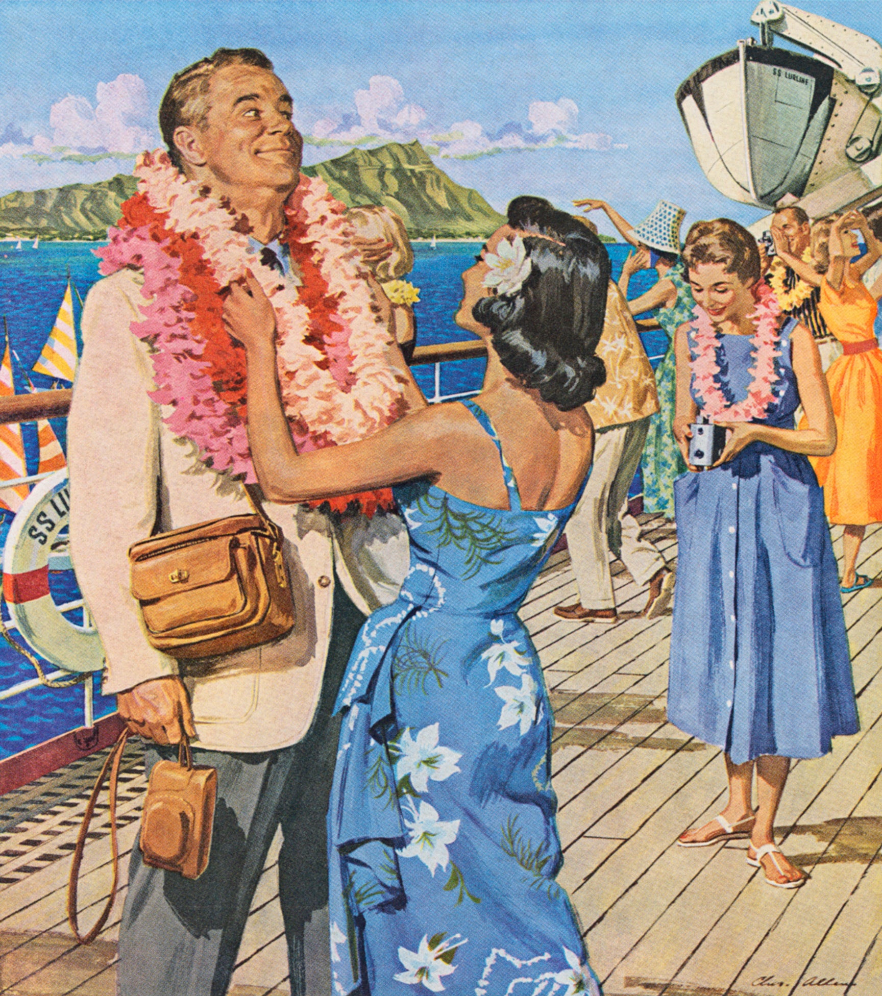 Charles Allen's artwork exemplifies the spirit of early Hawaii travel with vibrant imagery of experiences on board Matson cruise ships. The lei greeting quickly rose to become a prominent symbol of aloha and an iconic part of hospitality in Hawaii.
