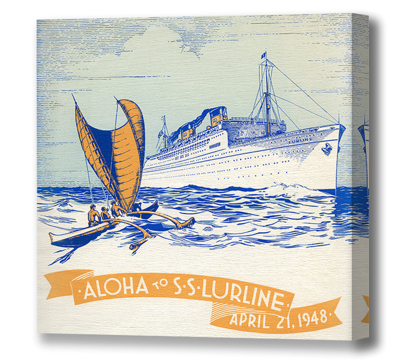 Join outrigger canoe riders as they greet the S.S. Lurline in this 1948 illustration.